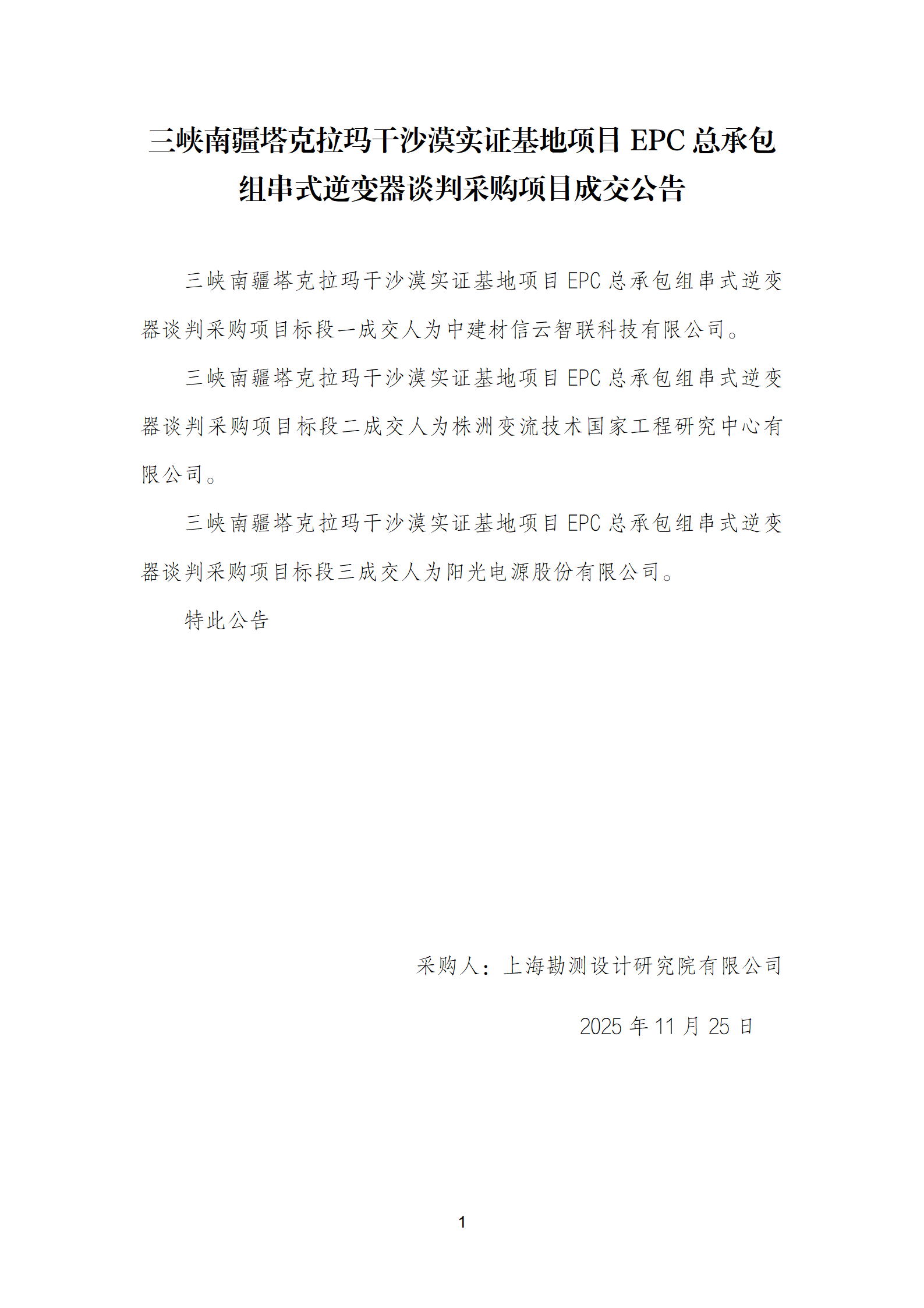 三峽南疆塔克拉瑪干沙漠實(shí)證基地項(xiàng)目EPC總承包組串式逆變器談判采購項(xiàng)目成交公告