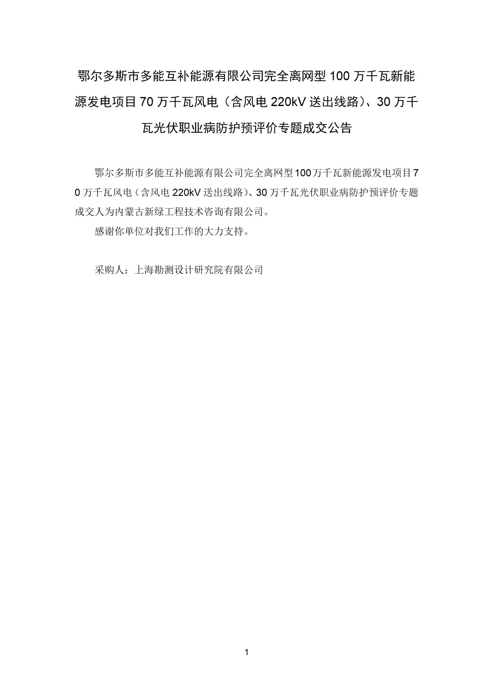 鄂爾多斯市多能互補能源有限公司完全離網型100萬千瓦新能源發電項目70萬千瓦風電(含風電220kV送出線路)、30萬千瓦光伏職業病防護預評價專題成交公告